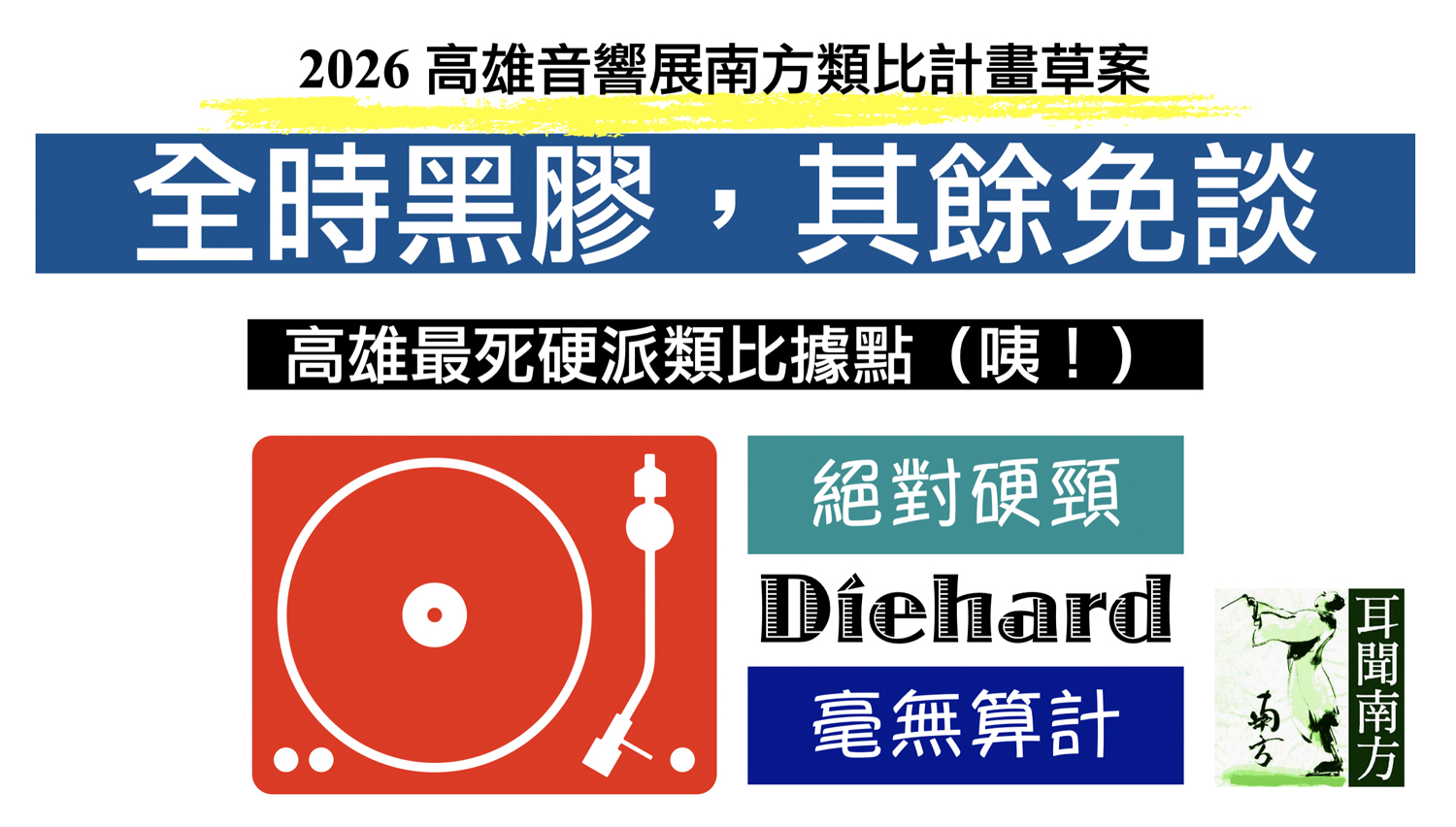 真的,專家都說睡眠要充足,頭腦要適度放空...,前幾天我難得早睡晚起,睡夢中我夢到自己正在高雄音響展南方展房認真為看展嘉賓選播音樂,睡多久 就夢多久 就站多久 就播多久,然後我發現夢中的我都在播放黑膠,一張接著一張地播著,早上醒來大腦還在開機的當下...就一直記得在夢中無限播黑膠這檔事,然後我就做了決定 --- 這絕對是老天爺給我的暗示,哈,2026 年高雄音響展咱南方展房就給他全時類比,以類比黑膠為唯一訊源,這樣應該很好玩吧! |